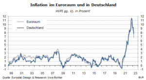 Ein Marktkommentar von Dieter Wermuth, Economist und Partner Wermuth Asset Management: Diese Woche gab es die Zahlen für die deutschen Erzeugerpreise im März: Sie sind im Vergleich zum Vormonat um 2,6 Prozent zurückgegangen, liegen jedoch immer noch um 7,5 Prozent über dem Wert von März 2022. Das Entscheidende und Erfreuliche ist, dass sie im 6-Monatszeitraum seit September mit einer annualisierten Rate von nicht weniger als 22,7 Prozent gesunken sind – von einem allerdings sehr hohen Niveau aus. Aber die Richtung stimmt, und in den anderen Ländern des Euroraums dürfte es nicht anders sein. Ähnliches tut sich bei den Verbraucherpreisen, wenn auch, wie üblich, mit weniger großen Ausschlägen.