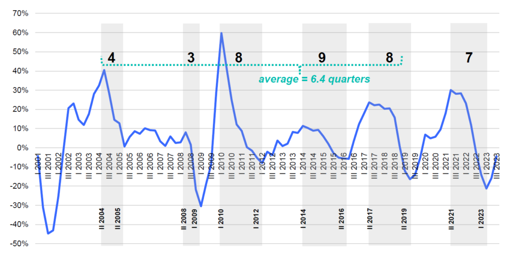 Der sechste, jüngste Zyklus erreichte im zweiten Quartal 2021 seinen Höhepunkt und scheint im ersten Quartal 2023 mit einem negativen Wachstum von -20 % seinen Tiefpunkt erreicht zu haben. Dies ist sieben Quartale nach dem Höchststand.3