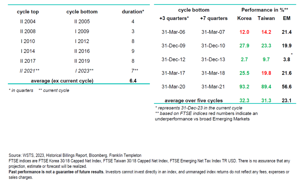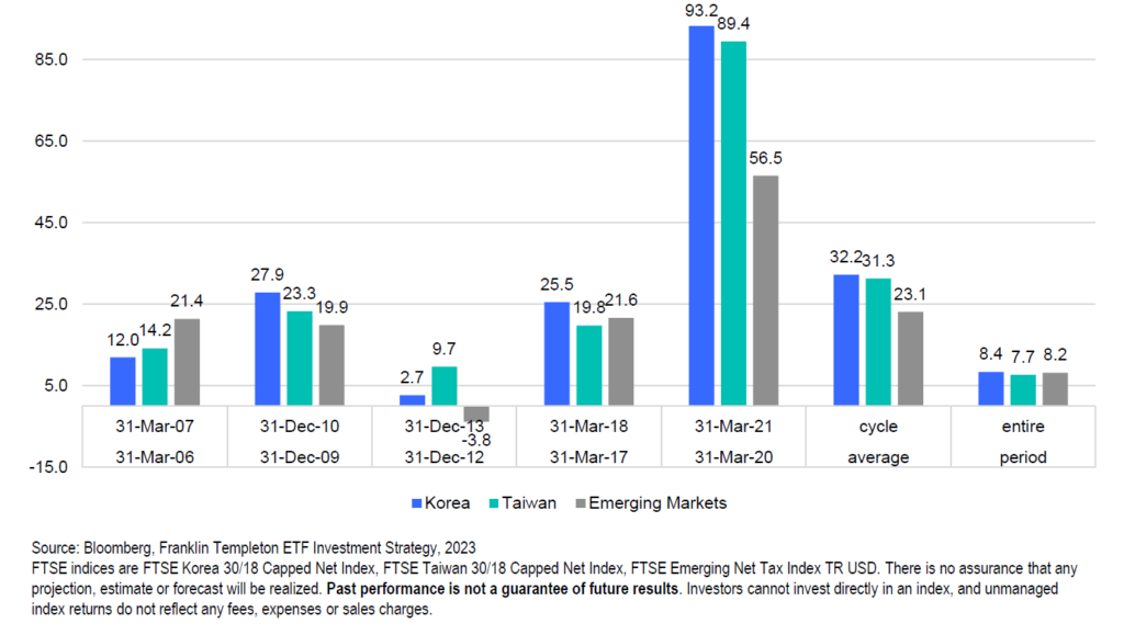 • Die durchschnittlichen Aktienrenditen nach dem Zyklus in Südkorea und Taiwan, von drei Quartalen nach dem Tiefpunkt bis zu sieben Quartalen nach dem Tiefpunkt, lagen bei über 30 % gegenüber 23 % für die breiten Schwellenländer.